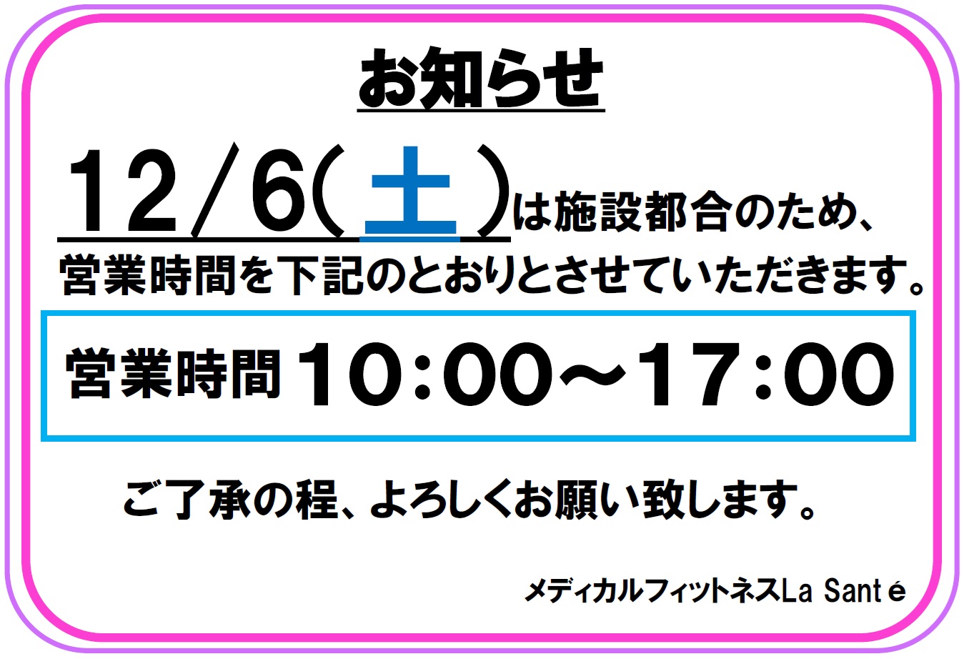 12/6(土)の営業時間は施設の都合により10:00~17:00とさせていただきます。