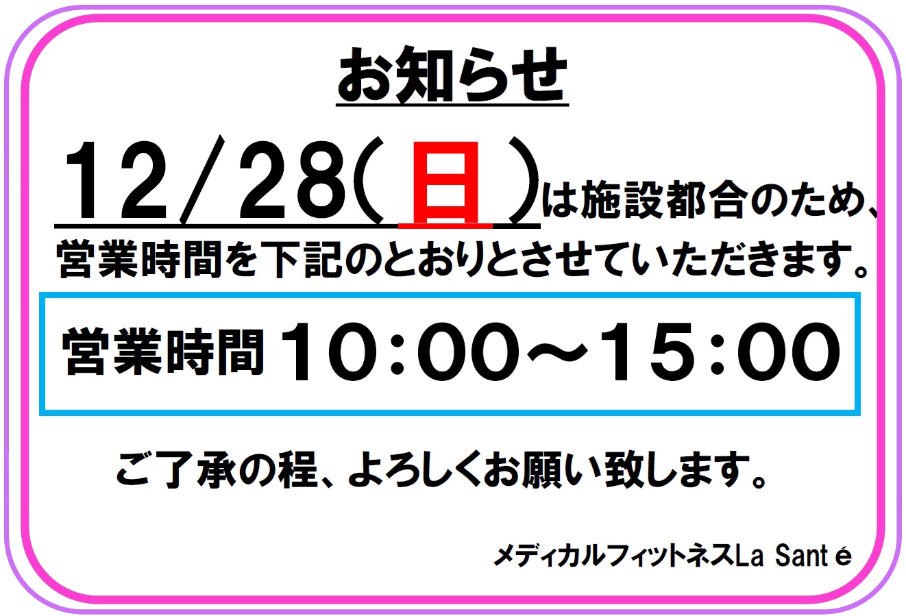 12/28日(日)の営業時間は施設の都合により10:00~15:00とさせていただきます。