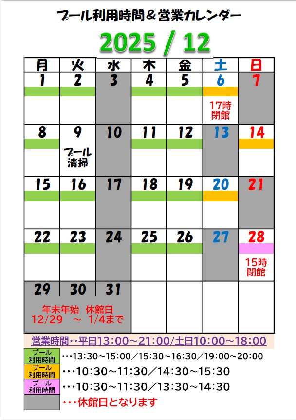 =ダウンロードPDFは:2025年12月プール利用時間カレンダーこちらから!