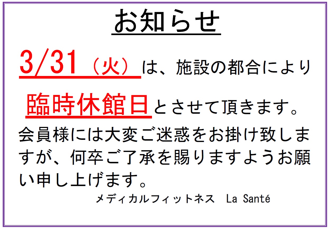 3月31日(火)は施設の都合により臨時休館日とさせていただきます。